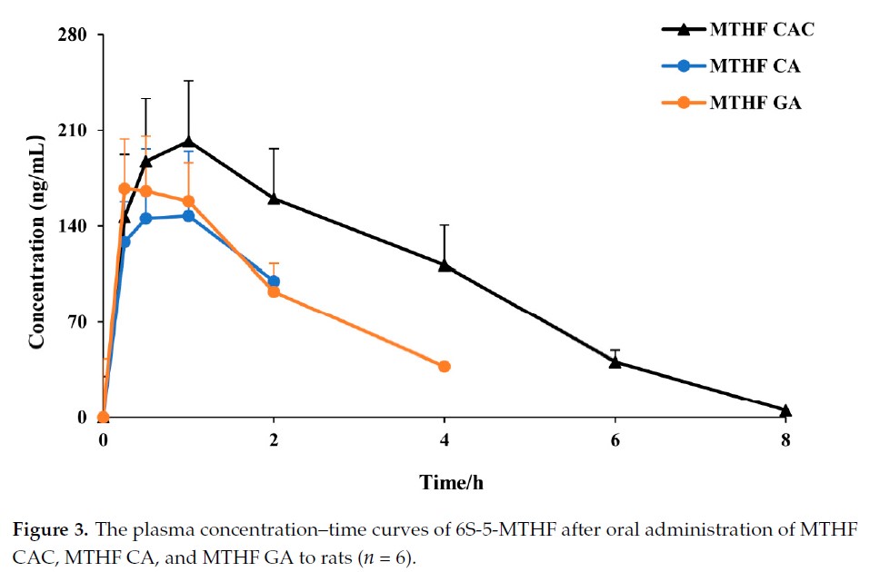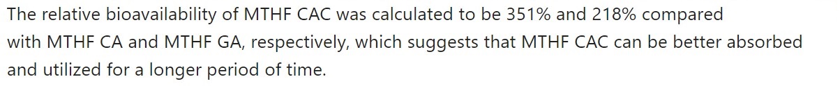 次世代葉酸的公開宣傳資料裡,以Lian et al. 2021 的大鼠實驗研究結論,推斷MTHF CAC具有最高的生物利用度(relative bioavailability, 以AUC(0-t)推導相對生物利用度),為MTHF CA的351%、為MTHF GA的218%。(Figure 3 & Table)