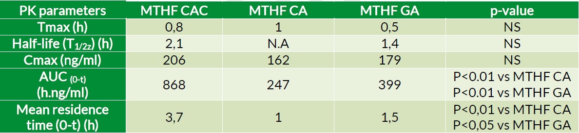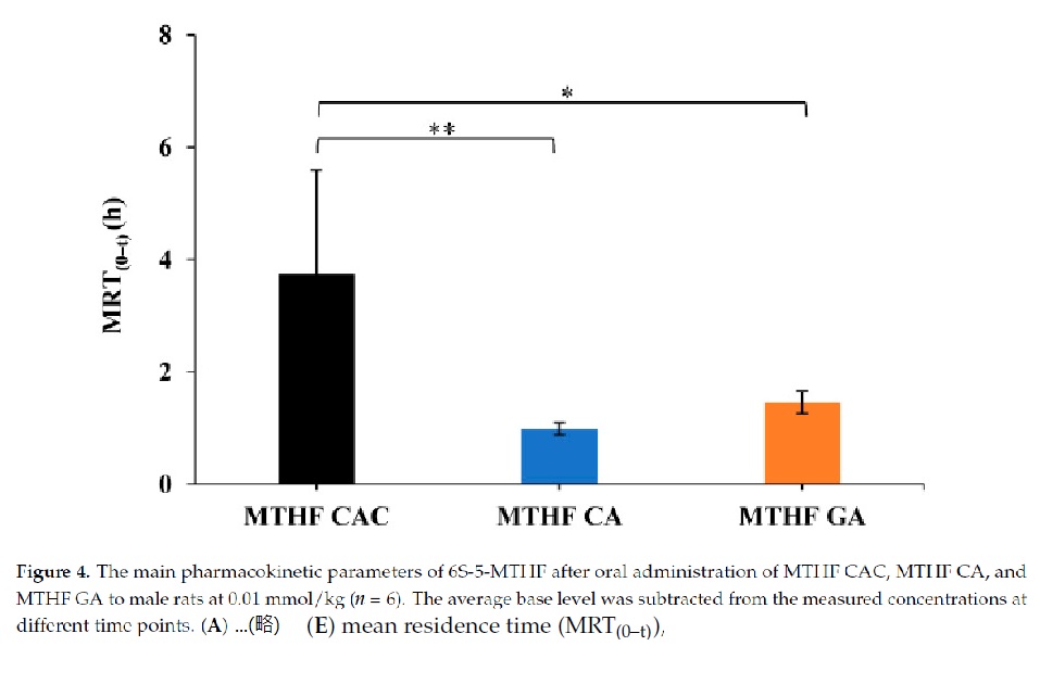 在平均體內停留時間(Mean residence times ; MRT(0-t))的評估項目裡,推斷MTHF CAC的停留時間3.7 +/- 1.9 h,顯著較MTHF CA的1.0 +/- 0.2 h (p<0.01)、MTHF GA的1.5 +/- 0.3 h (p<0.05) 增長數倍時間。(Figure 4E & Table)