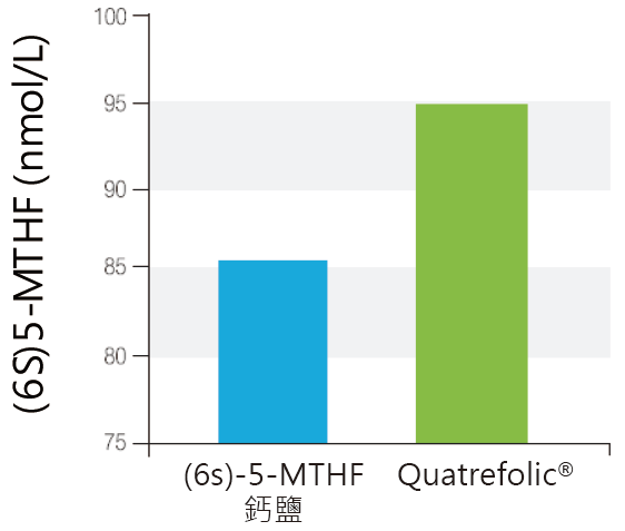 根據該實驗結果,Quatrefolic®能迅速被腸道吸收並運至血液,較傳統合成葉酸高出10倍的吸收。
