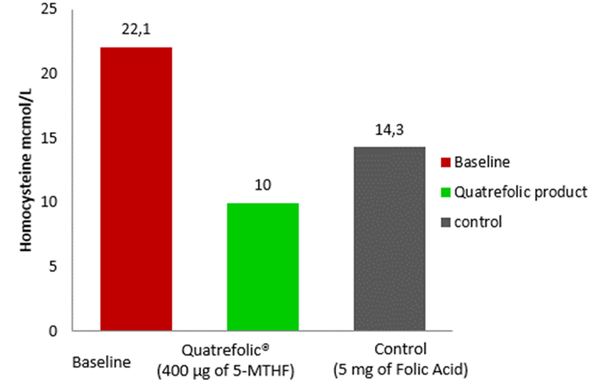 一項評估採用不同生理型態葉酸(合併使用維生素B6、B12)以降低血清中同半胱胺酸濃度的研究顯示,第四代葉酸活性5-MTHF葡萄糖胺(Quatrefolic®),較基準組(baseline)顯著降低血清中同半胱胺酸濃度達55.8%,且顯著優於第二代葉酸(合成葉酸)的降低能力。