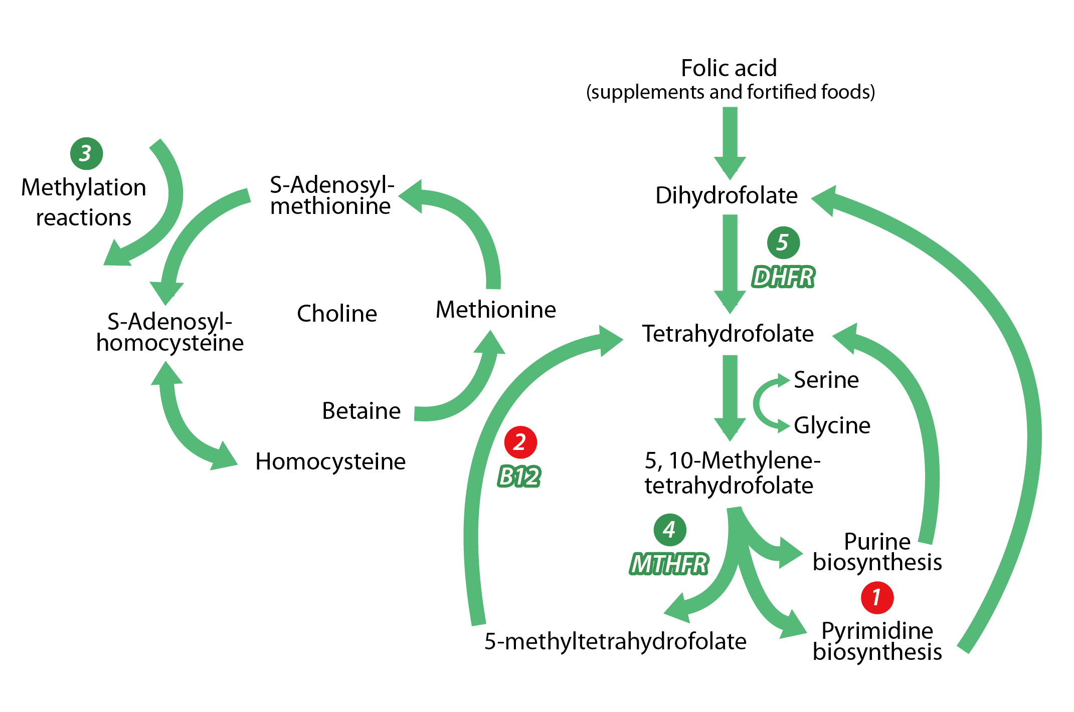 活性葉酸攝入人體後,由小腸絨毛吸收,以5-甲基四氫葉酸(5-MTHF)形式運入肝門靜脈,再進行後續的細胞利用或肝臟儲存。