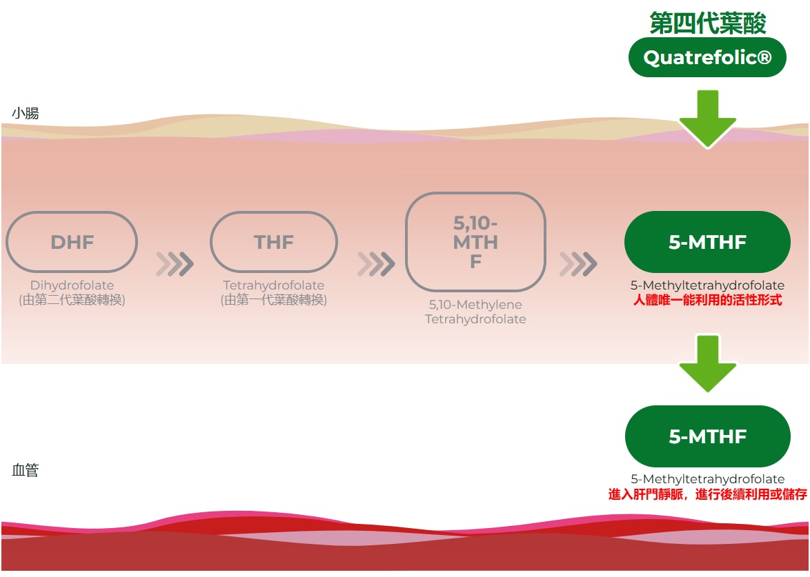 圖一:活性葉酸Quatrefolic® 於體內之代謝途徑