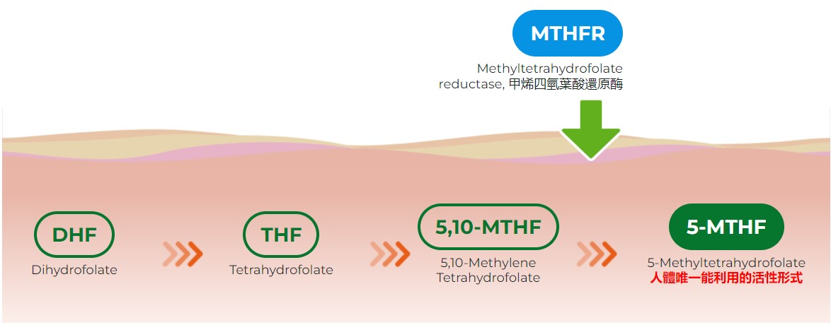MTHFR酵素(Methyltetrahydrofolate reductase, 甲基四氫葉酸還原酶),在葉酸的代謝途徑中,可讓5,10-MTHF轉換為5-MTHF(5-甲基四氫葉酸),才能進行後續的吸收利用。