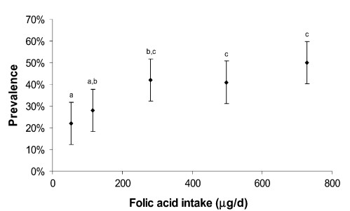 Nutrition Examination Survey (2001–2002) who had no evidence of renal dysfunction or history of stroke, recent anemia therapy, or diseases of the liver, thyroid, or coronary arteries (n = 852). Points represent least-squares geometric means adjusted for sex, age, and race-ethnicity. Points are plotted at the category medians. Points with the same lowercase letter do not differ