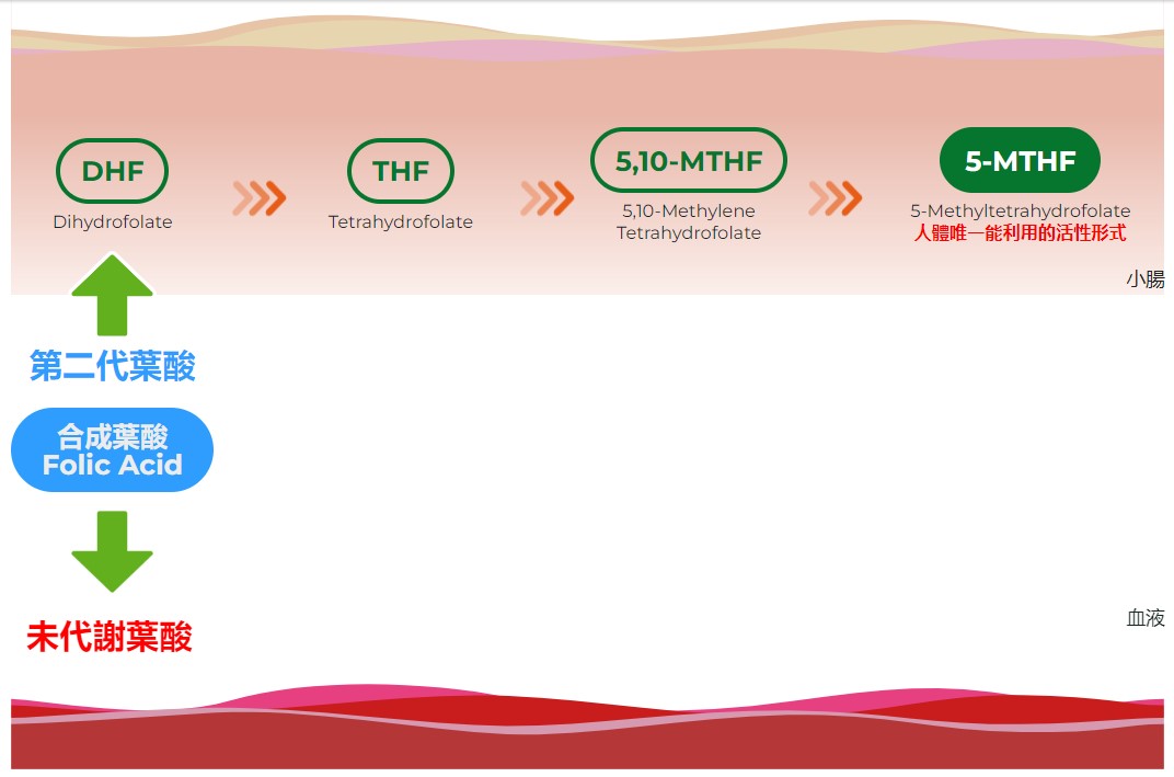而人體腸道對於將合成葉酸(第二代葉酸)轉化為 5-MTHF的能力非常有限,大多數均以未修飾的形態進入肝門靜脈循環。